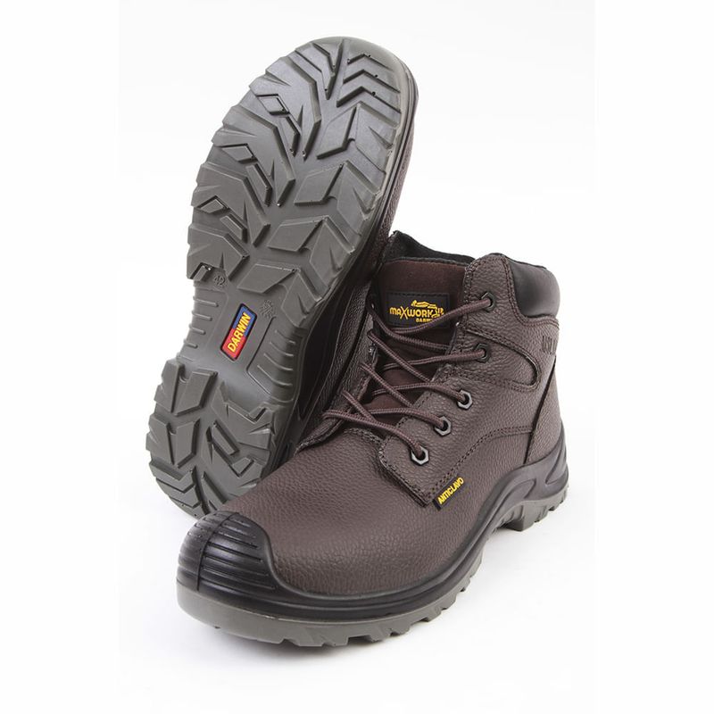 Botín de Seguridad Darwin Maxwork, pertence a la línea económica, sin dejar de lado la protección a sus pies. Dentro de sus atributos se encuentra: Aislante eléctrico, puntera y plantilla de acero, resistente a hidrocarburos. Ideal para realizar labores de industria, servicios/logísticos, obras civiles e ingeniería.