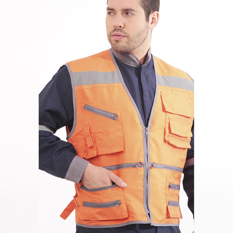 Aplicaciones de cinta reflectante de dos pulgadas. Bolsillos de diferentes tamaños con cierre. Ajustable en los costados. Tela confeccionada con factor de protección ultravioleta UPF 50+