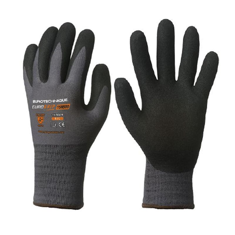 Guante Nitrilo Arenado 15N500 Eurothecnique, guante de nitrilo refuerzo de punto sin costuras en gris, nailon y spandex, calibre 15.